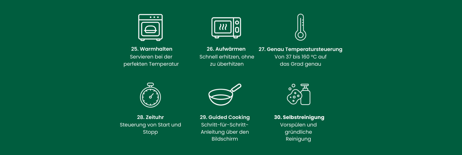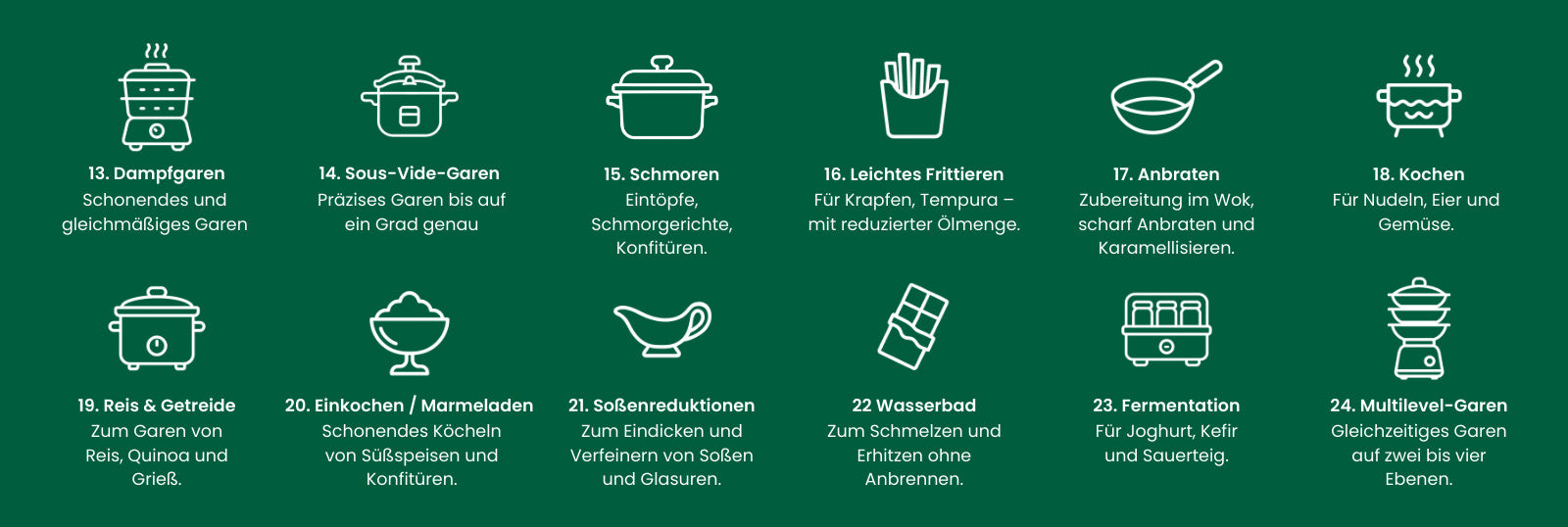 KITCHENEO® KT20 vereint bis zu 18 Features in einem einzigen Küchengerät: Kochen, Kneten, Mixen, Dampfgaren, Schmoren, Sous-Vide-Garen, Emulgieren, Zerkleinern, Wiegen u.v.m. Sie bietet drei Betriebsarten: manuell, geführt und vollautomtisch - für perfekte Ergebnisse, ganz gleich, ob du gerade erst mit dem Kochen beginnst oder bereits Profi bist.